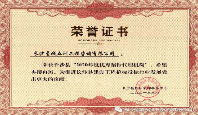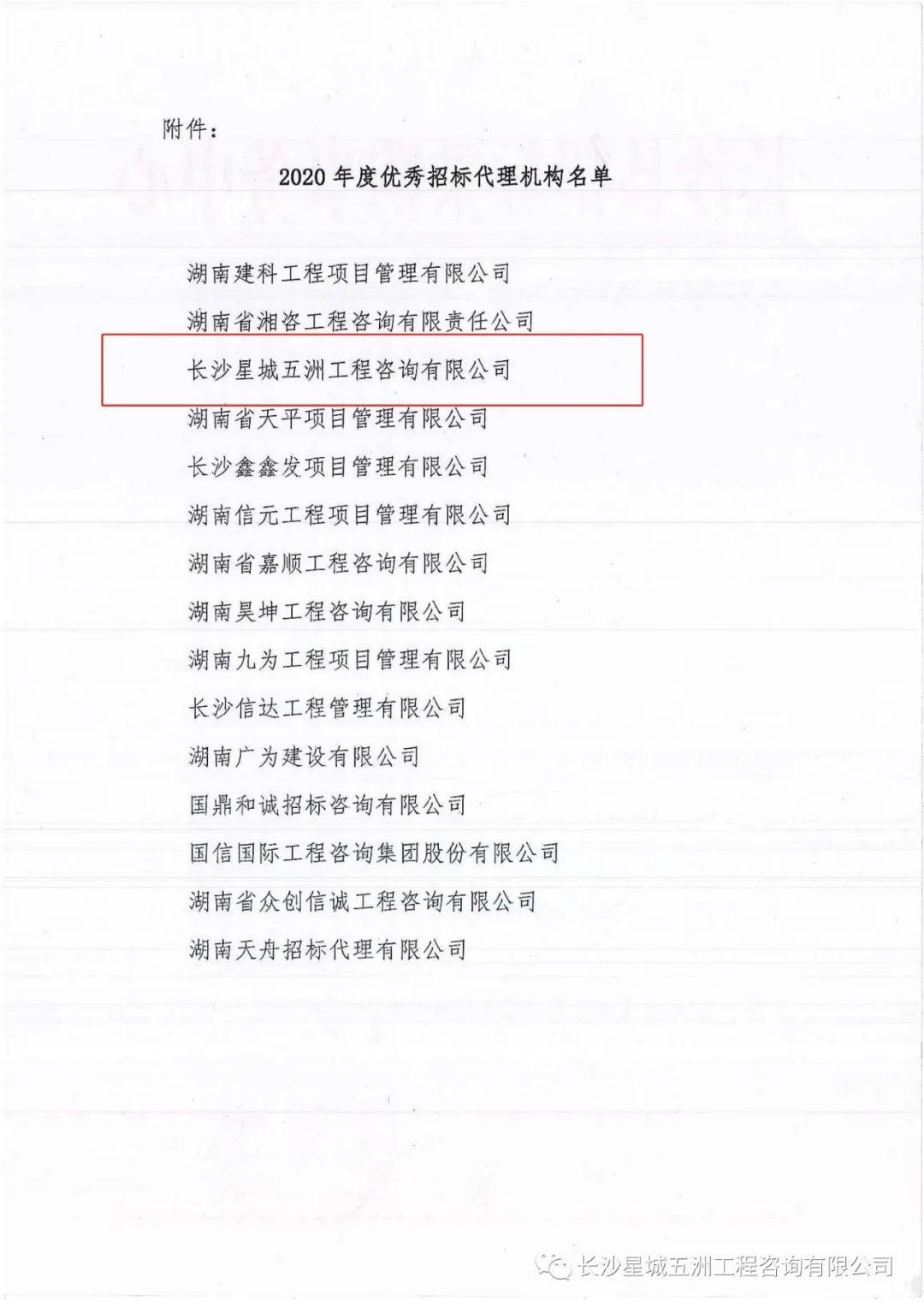喜报——长沙星城五洲工程咨询有限公司荣获“2020年度优秀招标代理机构”