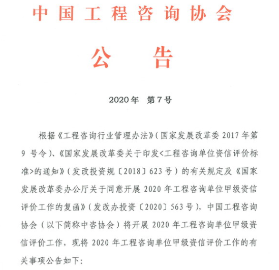 2020年工程咨询单位甲级资信评价有关事项的公告(中国工程咨询协会2020年第7号)